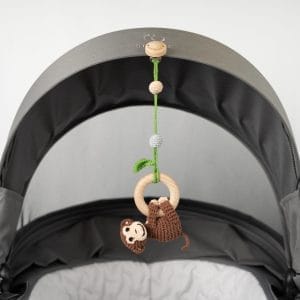 Äffchen CHARLIE 🐒 ist dreifach stark: als Spielbogenanhänger, Beißring und Kinderwagenanhänger. 3in1 – immer dabei, für glückliche Babys 👶 auf jeder Fahrt!